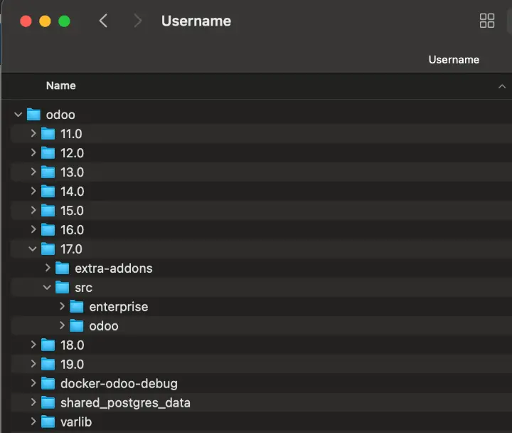 Структура содержит два каталога: «odoo» и «enterprise», которые представляют собой клонированные Git-репозитории версий Community и Enterprise.