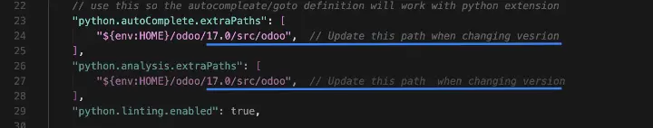 - Скопируйте из settings.json все переменные, начинающиеся с «odoo». Они находятся под комментарием "Docker Debug Variables".